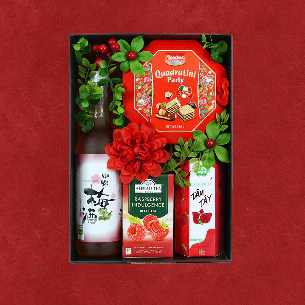 Tông đỏ rực rỡ, hộp hoa văn Tết truyền thống, chai vang sủi, thể hiện sự vui tươi, hân hoan.